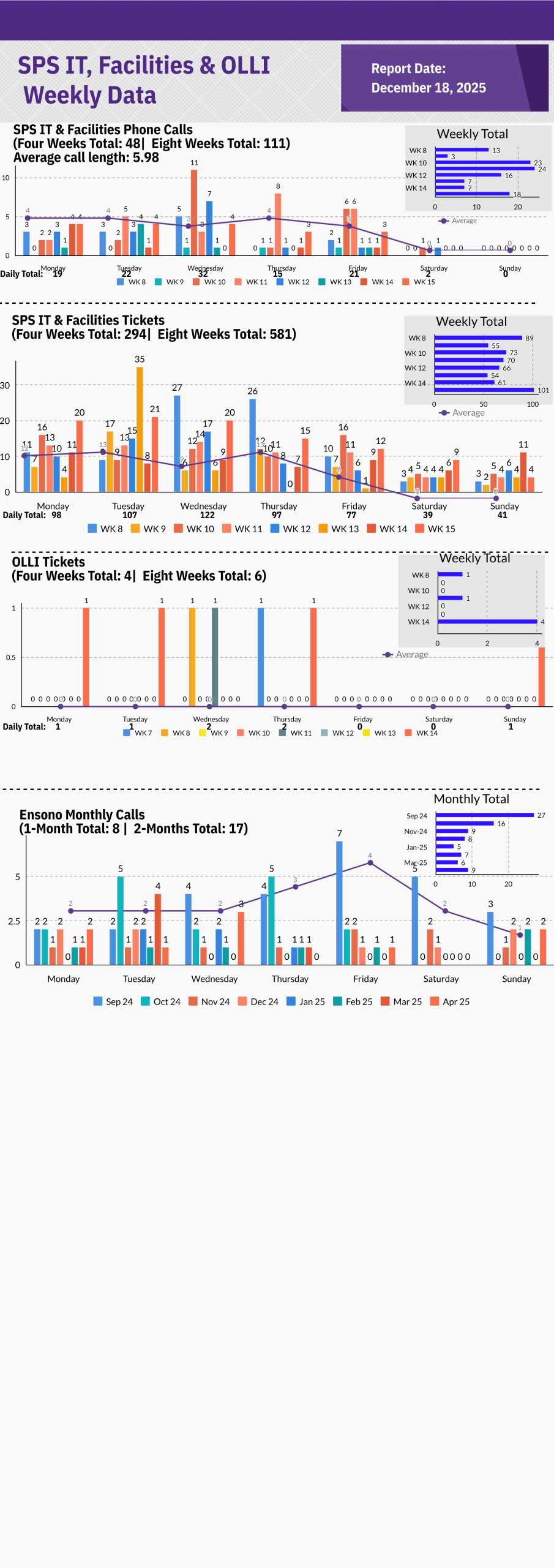 Information Technology and Facilities Service Desk Statistics August 20, 2024December 19, 2025 Lito Lomahan Download Week 14 (December 1 – December 7) Download Week 15 (December 8 – December 14)